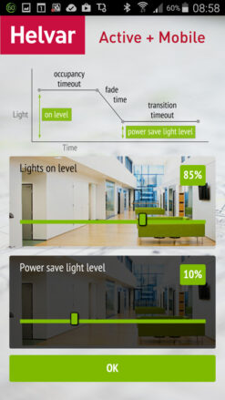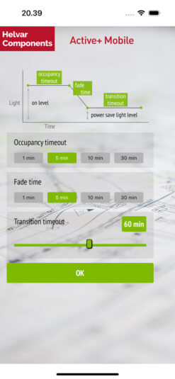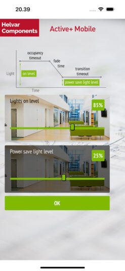The Active+ Mobile application provides an option to adjust the automatic settings. To use this app you must have smart phone for the application running iOS (version 8.0 onwards) equipped with an LED flash, a luminaire fitted with an Active+ LED driver and the Active+ Sense. (Application may be used also in Android phones, see user guide for more information).